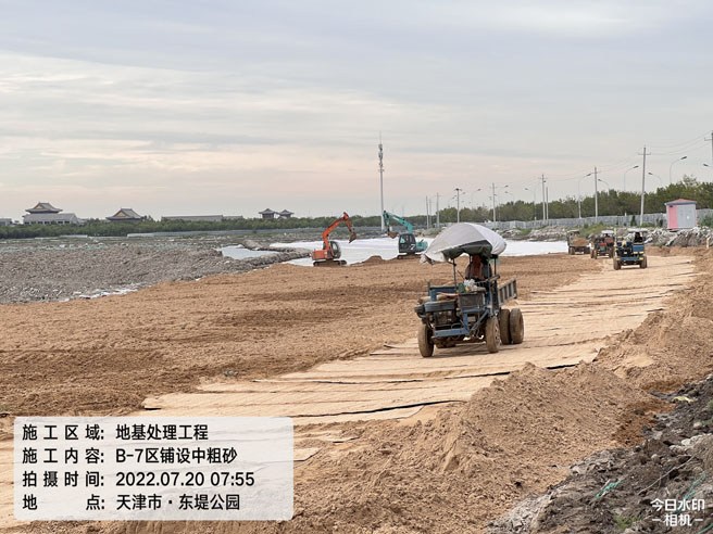 本工程位于中新天津生態(tài)城臨海新城東堤路西側(cè)四五六七區(qū)吹填區(qū)靠東堤路50m范圍內(nèi),寬度為42m,長度為2800m的帶狀區(qū)域,本工程采用堆載預(yù)壓方法完成軟土地基處理,總處理面積約119070平方米。